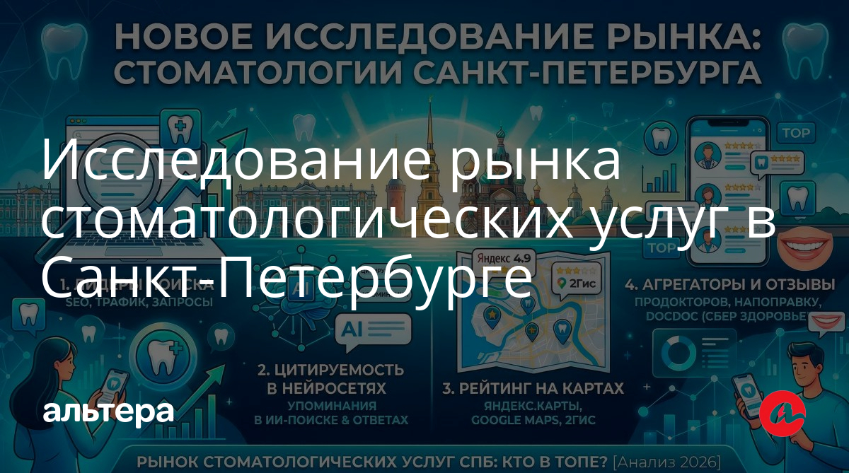 Хотите знать, видят ли потенциальные пациенты вашу клинику в поиске и что о вас говорят нейросети? Мы подготовили это исследование для владельцев стоматологий и маркетологов, которые хотят не гадать, а опираться на факты и цифры. В исследовании представлен объективный срез рынка: позиции в поисковых системах, присутствие и рейтинг на картах и агрегаторах, цитируемость в нейросетях. Эти данные можно использовать, чтобы оценить свои позиции и найти новые точки роста.